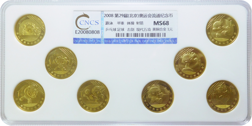 第29屆(北京)奧運會流通紀念幣評級套裝完整收錄了我國2006年發行至今共三組奧運流通紀念幣8枚,每枚紀念幣面值1元,屬中國法定貨幣。紀念幣面值為1元,正面均為北京奧運會徽及國家體育場俯視圖,背面分別是福娃游泳、舉重、體操、射箭、乒乓球、足球、擊劍、現代五項的運動造型。